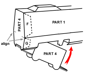 Figure 5 fit of bogie into car body.Step 23 Glue part 4 onto the bottom of the car as shown by the red arrow in figure 5 above. Make sure everything is aligned straight and square.