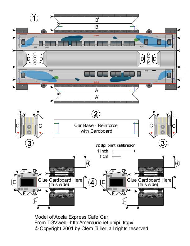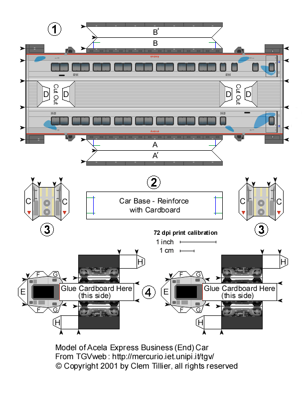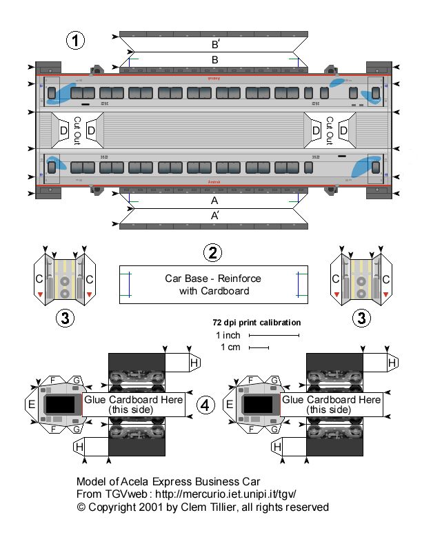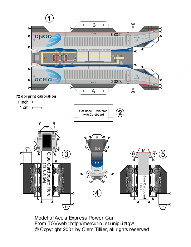 Prototype Model This is a complete scale model of Amtrak's Acela Express high speed train. You can build either of two prototype trainsets: Trainset 5 (with power cars 2009 and 2020) or Trainset 10 (with power cars 2016 and 2038). Select the links below to view and print the parts sheets, making sure to read the corresponding instruction sheet before starting. If you have never built a card model before, this may not be the easiest one to start with-- but remember, you can always just print another one and start over. Each vehicle will take you about 45 minutes to 1 hour to build.