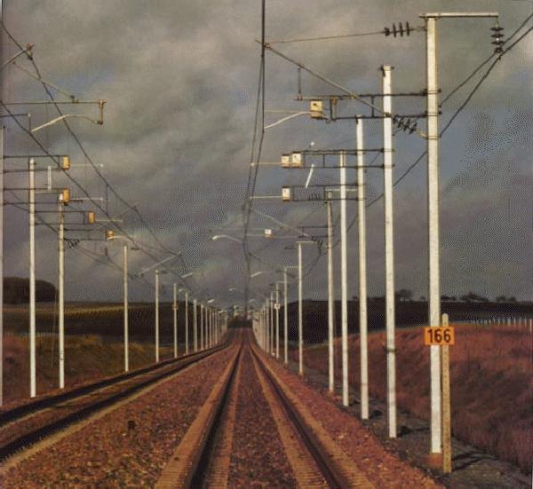 Picture 1: The section of track where the records were set. Catenary masts in the foreground are equipped to measure contact wire displacement.