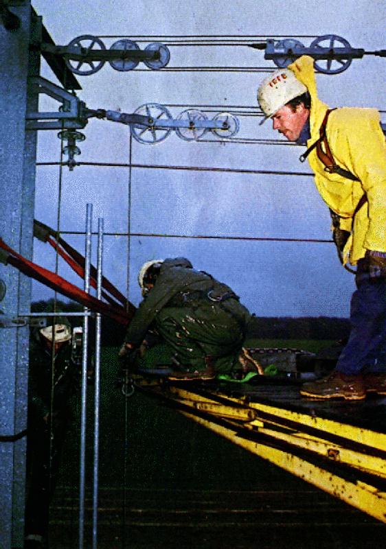 Picture 2: Technicians installing strain gauges on the expansion joint located at the end of Loir bridge.Picture 3: Inspection and tensioning of the catenary. The counterweights are hung along the catenary mast, and tension the wire through the system of pulleys.