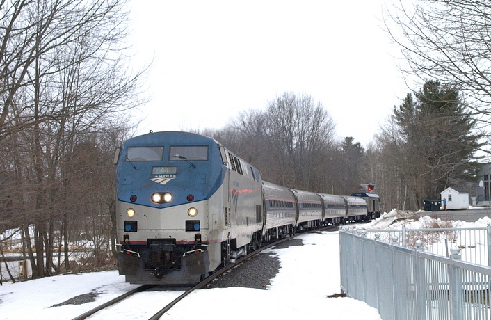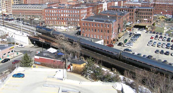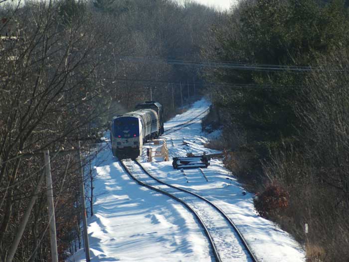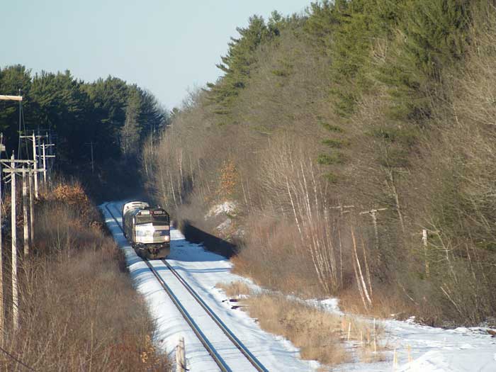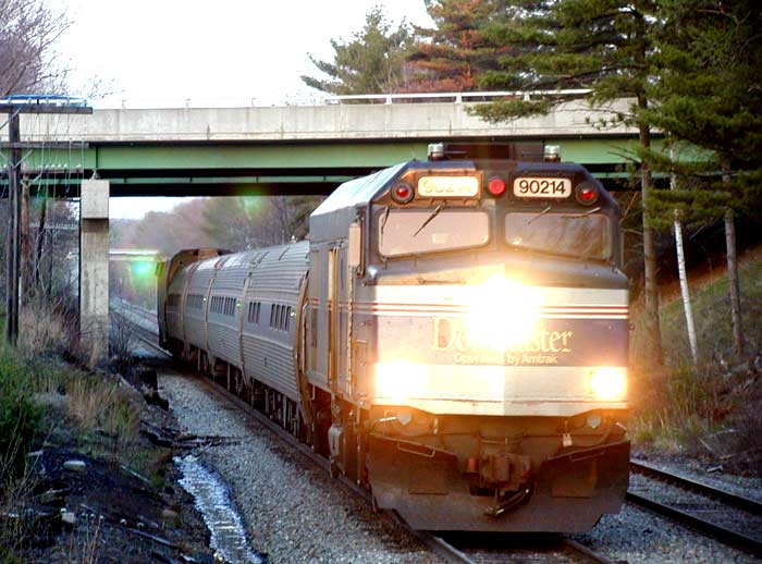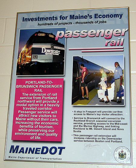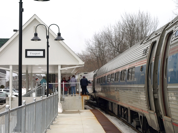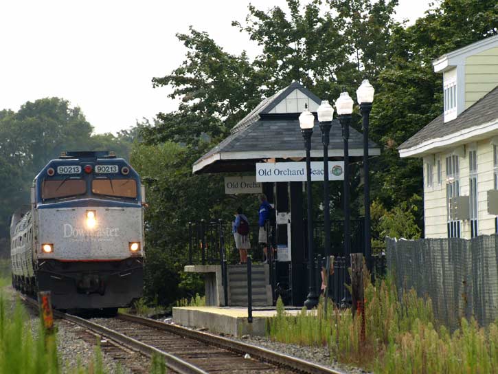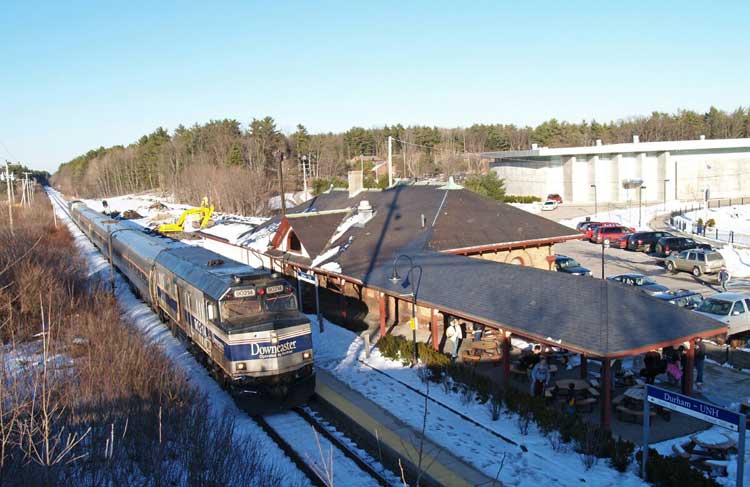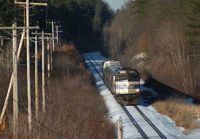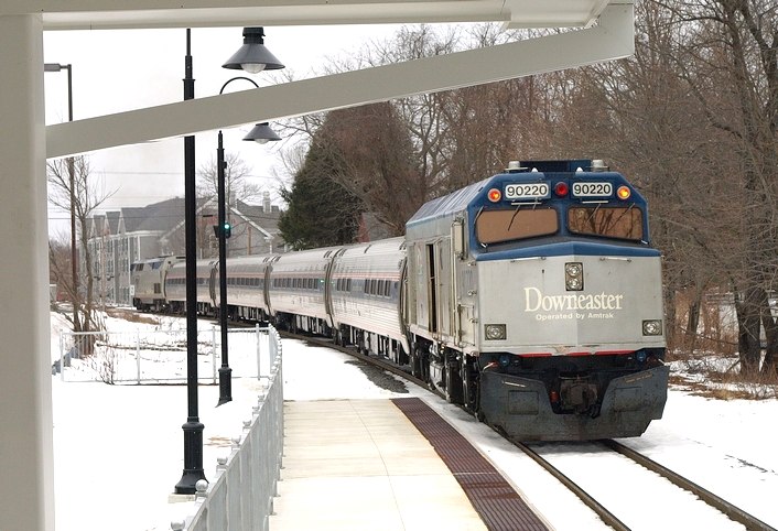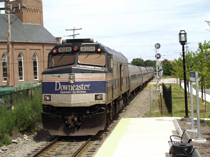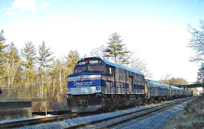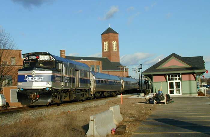 Amtrak's Downeaster runs from Boston's North Station to Portland, Maine, five times a day, with two trips going on to Freeport and Brunswick (and one additional round trip between Portland and Brunswick) stopping at several Massachusetts, New Hampshire and Maine towns. The train started running on December 14, 2001, and carries standard Amfleet coaches and cafe car. We've have had an opportunity to do some photography since its inception and are especially impressed by the small transportation centers springing up in towns like Dover, NH, and Wells, Maine, as well as by surveys which show high customer satisfaction. It was a struggle to get the train running, what with endless roadblocks created by Guildford Transportation, which owns the old Boston and Maine tracks over which the train runs. Fortunately, TraiinRiders/Northeast kept on the pressure through its RailVision PAC to collect signatures (close to 90,000) in Maine to force state government to spend no less than $40 million dollars to get things on track. Happily, with this help Amtrak and the train's sponsor, the New England Rail Passenger Authority, have prevailed. Happily, the service expanded to Freeport-Brunswick in Novermber, 2012. The train has food service, business class and free wi-fi for all. Train hosts assist passengers at station stops. Here are some of our photos. Click on thumbnails to enlarge.