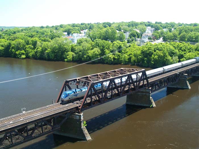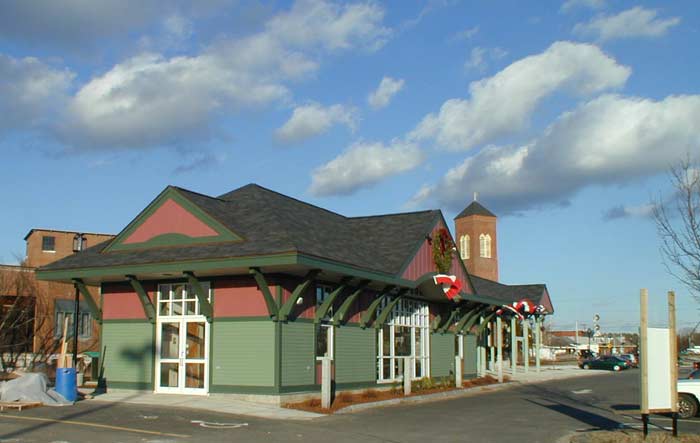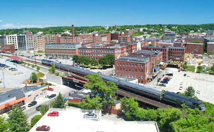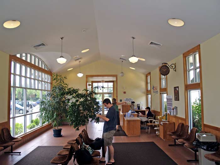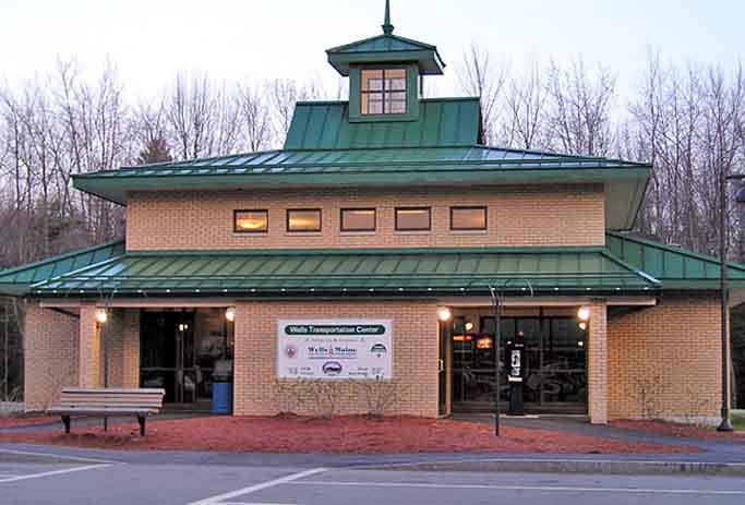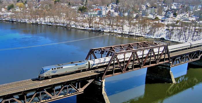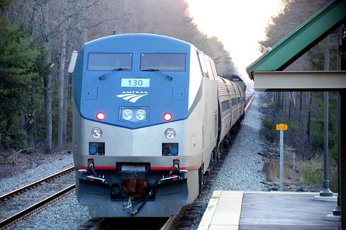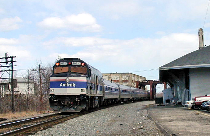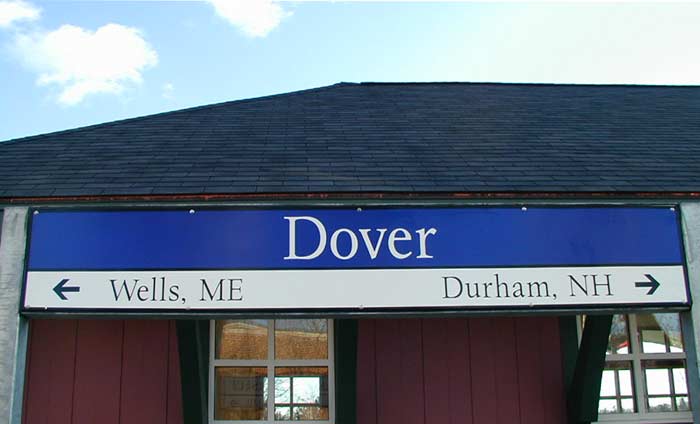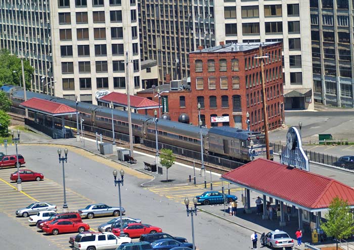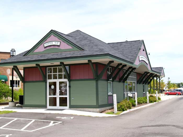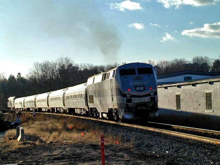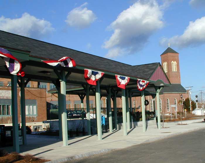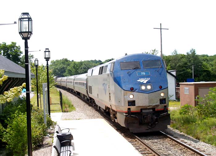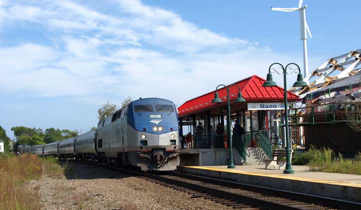 Amtrak's Downeaster runs from Boston's North Station to Portland, Maine, five times a day, with two trips going on to Freeport and Brunswick (and one additional round trip between Portland and Brunswick) stopping at several Massachusetts, New Hampshire and Maine towns. The train started running on December 14, 2001, and carries standard Amfleet coaches and cafe car. We've have had an opportunity to do some photography since its inception and are especially impressed by the small transportation centers springing up in towns like Dover, NH, and Wells, Maine, as well as by surveys which show high customer satisfaction. It was a struggle to get the train running, what with endless roadblocks created by Guildford Transportation, which owns the old Boston and Maine tracks over which the train runs. Fortunately, TraiinRiders/Northeast kept on the pressure through its RailVision PAC to collect signatures (close to 90,000) in Maine to force state government to spend no less than $40 million dollars to get things on track. Happily, with this help Amtrak and the train's sponsor, the New England Rail Passenger Authority, have prevailed. Happily, the service expanded to Freeport-Brunswick in Novermber, 2012. The train has food service, business class and free wi-fi for all. Train hosts assist passengers at station stops. Here are some of our photos. Click on thumbnails to enlarge.