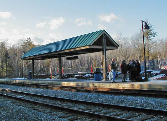 We were finally able to photograph the train in Freeport on a wintry day in February, 2013, on its way from Boston to Brunswick. A large crowd exited, many doubtless heading to the huge LLBean store.