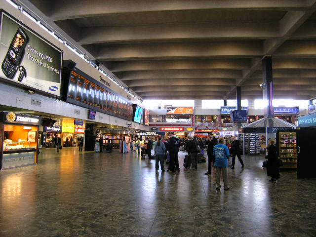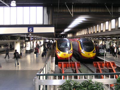 | 2005 Update We visited the UK in May, 2005. Though we were able to do a fair amount of photography in the North of England (which we'll be posting elsewhere) we did get to take our first extensive Pendolino trip, going from London Euston to Liverpool Lime Street and return. Our overall impression of the trains has not changed. They are sleek, modern, more like an airplane than traditional train and still frought with bugs -- all the toilets on our Lime Street to Euston train shut down around Crewe, which was bad for beer business and more than a few passengers. Both of our trains were crowded. Because I was doing relatively little rail travel I did not purchase a first class railpass. Second class travel was not uncomfortable, but, being tall, I did feel somewhat cramped and would have been very much more so if I had a companion in the adjacent seat. The first photos were taken at London Euston.