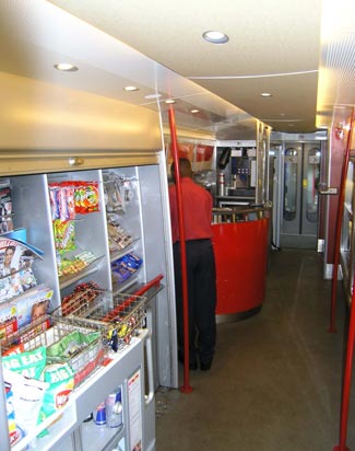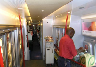 Next, we see a Pendo at Lime Street, has had a roughly $35,000,000 rebuild of its trainshed, and photos of a Pendo coach section, and the on-train shop, which efficiently sells everything from food and drink to magazines and cd's.