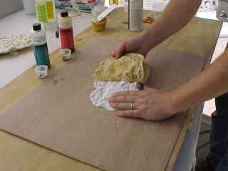 well feathered edges you can overlap with nearly seamless edges. Multiple resin layers are OK and you can also use the foam mix from the previous review to back it without screen though. The demo taught me to use different areas of the larger mold to cast similar rock styles. By moving just a bit, each casting will be different and with over lapping the casting areas it will limit repetitive patterns. You can take a 12” X 18” mold and easily cast 28” X 40” worth of rock with good placement. Once we placed and glued (we preferred a low temp hot glue gun, oh yea use gloves! Trust me)