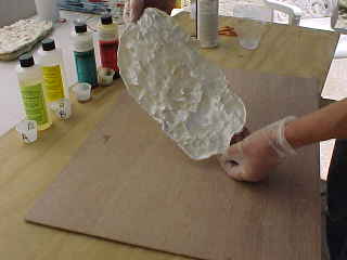 resin the first day. If you pour it thick it becomes too stiff to work and you will have weak or blank spots and when you place the piece that may break or crack. You need to spread it out thinly, as it sets up (don’t wait till it changes to opaque or thickens) use a disposable brush or cardboard with fine finger like cuts on the end. Once spread out and lightly thickening flip it over hold it up over the news paper to allow the material to run to the now low points that were the high point on the molds when they were lying upright. Try to limit how much you use to only one ounce of each part at a time, cast small areas at one time this will also help with placement. With