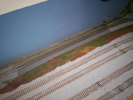 As always start with a plan, it can changes as most of ours have to some degree but have an idea before you start. We painted the surface a base color for uniformity just in case scenery didn’t cover; it also helped our vision of what we wanted to end up with. We used acrylic art paint found at just about any art supply isle or store you visit (inexpensive too). We found that an airbrush works great if you don’t have scenery to protect from overspray and you dilute it 60:40 water to paint. It is easy to cover large areas however it provides a uniform color once dry unless you plan specific alterations to provide depth or texture or alter paint mixes with different shades, we chose the later. I found it easier to start with the lightest colored areas for high points and edges then slowly add darker tones to create depth in the shallows when needed. This holds true when brushing paint on too. I chose a ½” brush to control texture, takes longer to cover the area but I prefer the control of the smaller brush. I alternate my grip side to side and rotate the brush slightly in my fingers to prevent a repeat pattern in the paint (If anyone remembers Bob Ross, Joy of painting. He was corny but really good and explained everything he did as he did it). By adding small drops of paint as you go and alternating color/tint you can simulate earth tone changes well. I was really surprised how much grey everything has as a shade, it works like a bit of yellow does to accent sunlight on plant material. By lightly airbrushing grey over green/brown on the edges of a dirt road you can simulate dusting from the traffic. We also airbrushed the ballast tone on the cork road bed before applying it to ensure even color distribution (check out pics page).