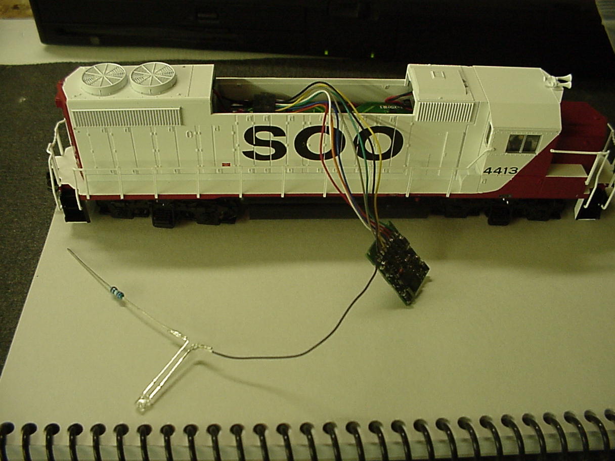 r foot print) to the green lead which is the lead for Output C on my Lenz decoder. I also soldered a wire to the other lead of the LED and connected it to the common side of the front headlight. After testing the operation I covered the two legs with heat shrink to ensure no shorting. I replaced the headlights and used hot glue to hold them and the LED in place. Now I have a SD60 with the detail of a rotary beacon that will flash using function 1 on my Digitrax controller.
