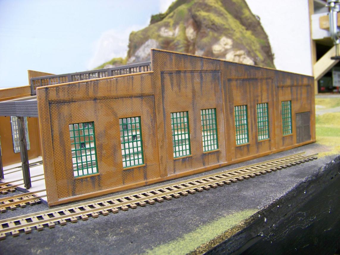 e too far. That has not seemed to be the case for me. Once I step back from it and look at it from the big picture side it blends very well. I have been using very simple techniques to get the effects that I have been looking for. There are two layers of the effects that I have been working one. The first is the undercoat and the last … you guessed it is the overcoat. My undercoat is mainly to give some definition to the bricks and mortar. As most building do not run the same color as the bricks from the foundation to the roofline. I accomplish this by using a wash of gray with a little water to thin it a bit. The thinning of the paint allows it to flow into the spaces between the bricks more effectively. I am not concerned about getting the wash on top of the bricks because the will help in causing the bricks not to all hold a uniform coloring. I work in small areas dabbing the brush in the mortar wash then onto the area I am starting with. I allow the wash to seep into the crevices and run down the structure toward the foundation. Doing this will also help give the illusion of the weather (i.e. rain) giving weathered