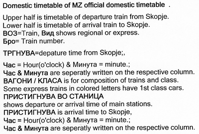 Macedonia Railways (MZ) Macedonia Railways iMZ) official@ MZ-Macedonia non-official Official Home Page: Domestic timetable Clicking leads to official domestic timetable written in macedonian.