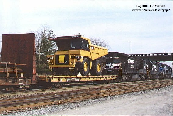 of the cars are flats with Caterpillar equipment as seen in this picture. |