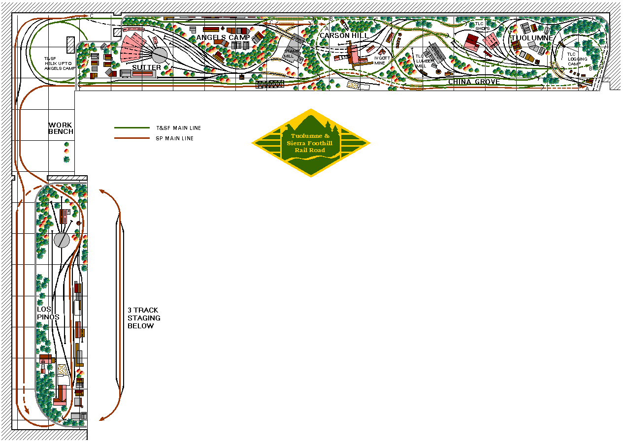 | Scenery construction | Hardshell (Woodland Scenics Plaster Cloth) over cardboard webbing and rigid insulation. Rocks are cast in molds, placed while wet and later painted with acrylics. Trees are a mixture of dried plant armitures with Woodland Scenics foliage and tall pines of rope fiber twisted in wire trunks, spray painted and flocked. Structures are mostly kitbashed from a variety of sources with several scratchbuilt. |