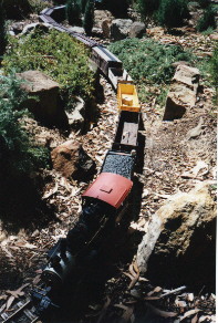 By the time the gold boom had passed, the Territory was being settled by people from the east who had heard of the open spaces and the farm land waiting for development. Within a decade the area was a scattering of cleared land, crops and hamlets, and productivity in the lush growing conditions was such that local requirements were more than satisfied and the farmers looked for new markets for their produce. The transport of the day was the horse-drawn wagon, and the roads little more than muddy wheelruts thru the trees. In the east and in the older western regions the coming of the steam engine had revolutionized marketing, with fresh produce available in cities in days instead of weeks. Accordingly, the local residents of the region, now know as Selbyville, began agitating for a railroad spur from the west coast to service their valley. A public subscription was begun, led by Emmett Selby, and presentations were made to the infant legislature of the Territory. The case of the residents was bolstered by discovery of silver in workable quantities in the near hills. Subsequently, a right-of-way was soon in the initial stages of surveying. It was determined that the line would be of 3'6" gauge, with interchange at Rowel Flat, a valley a few miles from Selbyville, where water and lumber were available in quantity. The line would follow the valley, at times passing thru narrow gulches until it reached Fenster, the burgeoning site of a dairy industry. The right-of-way ran thru mostly undulating country until it came to an un-named granite and basalt range. The survey team investigated a number of alternate routes to get the line past this obstruction, but short of a twenty mile detour, they determined that the only way thru was a ledge blasted out of the cliff face with the line clinging precariously above a sheer drop, a cliff so steep that it looked like an artificial stone wall. The head surveyor noted in his day journal "It is my opinion that the only way we will get a locomotive past this ridge is by the engineer holding on with his toenails." Thus the name Toenail Ridge was born.