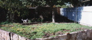 Construction began in June,1996. The first job was removal of a dead tree and poisoning of long-neglected weeds. The area had been ignored for so long that when the top-soil was turned over, a concrete garden path was discovered at a depth of six inches. Do you know how long it takes natural mulch to build up to the depth of half a foot? Needless to say, this path had to be broken up and removed, setting back the schedule by a number of weeks. Following initial cleanup, an underground watering system was laid and stakes driven in to give a level to fill to. A friend kindly donated a ton or more of medium sized rocks from an old wall and these were roughly located to form a backbone scenery divider.