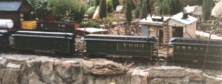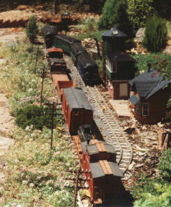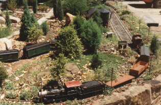 The Toenail Ridge Shortline, like many garden railways, is primarily designed to be watched rather than prototypically operated. It is really a good excuse to stand in the back yard with a glass in the hand. Some scope for operation has been provided, with a passing siding and a couple of switching sidings servicing the area. Carloads are supplied by the diary farm at Fenster (which is located by the back fence) and mining and logging provisions are on-shipped as they appear over the horizon.
