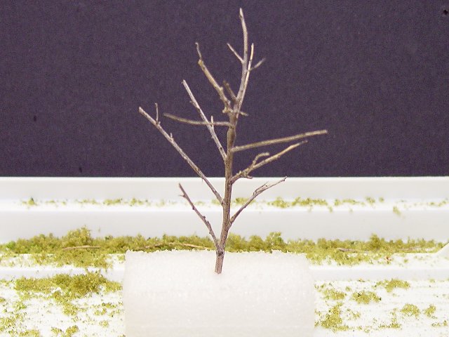 | I begin making a tree by cutting off a section of branch and trimming it to a basic tree shape. This is the New Mexico bush and it is already the perfect color. Some of the "trunks" are too light so I spray them with the air brush using a mixture of Tamiya acrylic Flat Black and Hull Red, heavily diluted with water. This gives me a good approximation of bark. I poke a small hole in a piece of foam to hold the piece while I work on it and to keep my fingers away from the adhesive spray. | FIGURE 3 |