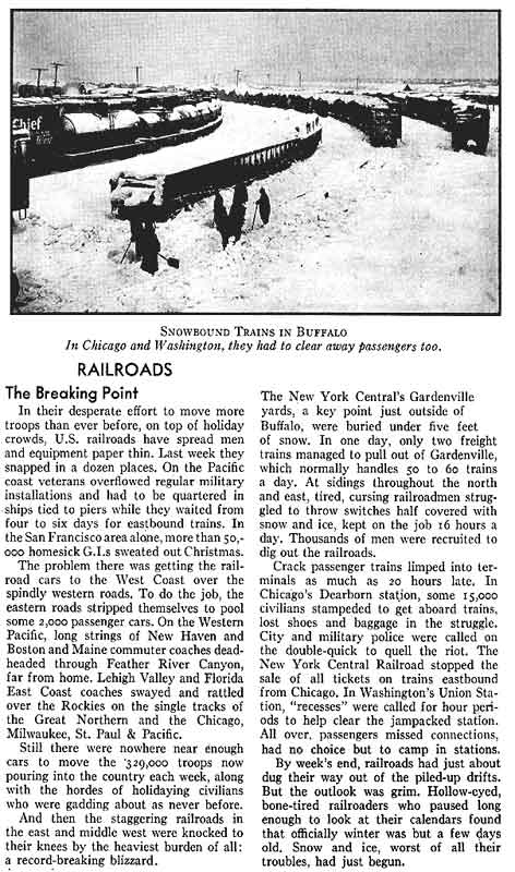 Thousands of men were recruited to dig out the railroads. Crack passenger trains limped into terminals as much as 20 hours late. In Chicago's Dearborn station, some 15,000 civilians stampeded to get aboard trains, lost shoes and baggage in the struggle. City and military police were called on the double-quick to quell the riot. The New York Central Railroad stopped the sale of all tickets on trains eastbound from Chicago. In Washington's Union Station, "recesses" were called for hour periods to help clear the jampacked station. All over, passengers missed connections, had no choice but to camp in stations. By week's end, railroads had just about dug their way out of the piled-up drifts. But the outlook was grim. Hollow-eyed, bone-tired railroaders who paused long enough to look at their calendars found that officially winter was but a few days old. Snow and Ice, worst of all their troubles, had just begun. |