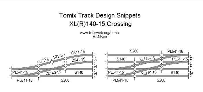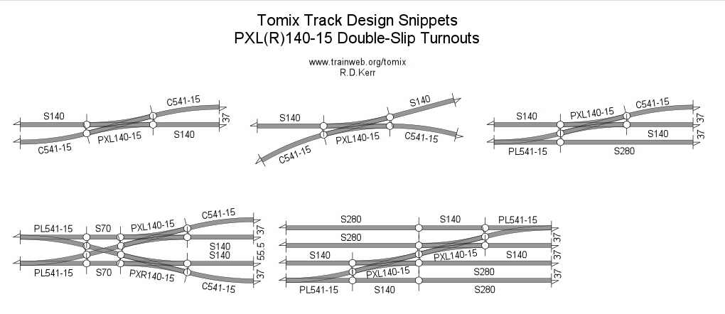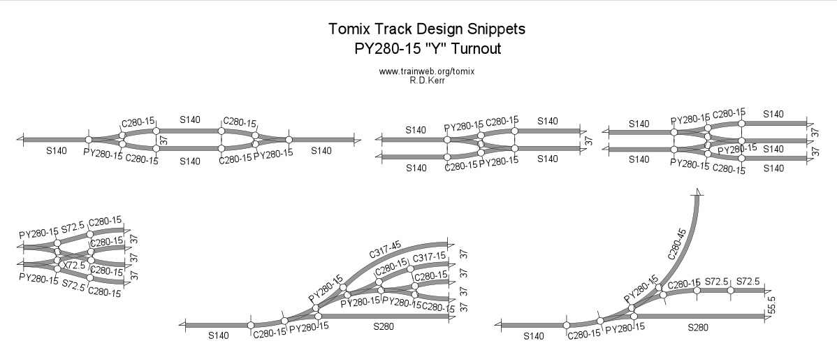 This page provides useful arrangements of Tomix N-gauge sectional track. These "snippets" serve to help understand how the Tomix track system works, and they can be incorporated into layout designs. Tomix track piece designations use millimeter measurements. Remember that 280 mm equals about 11 inches, 140 mm is about 5.5 inches, and 37 mm is about 1.5 inches. Clicking on most images will bring up a larger version, which can then be saved or printed out. The drawings below were made with AnyRail software, which includes a Tomix track library.