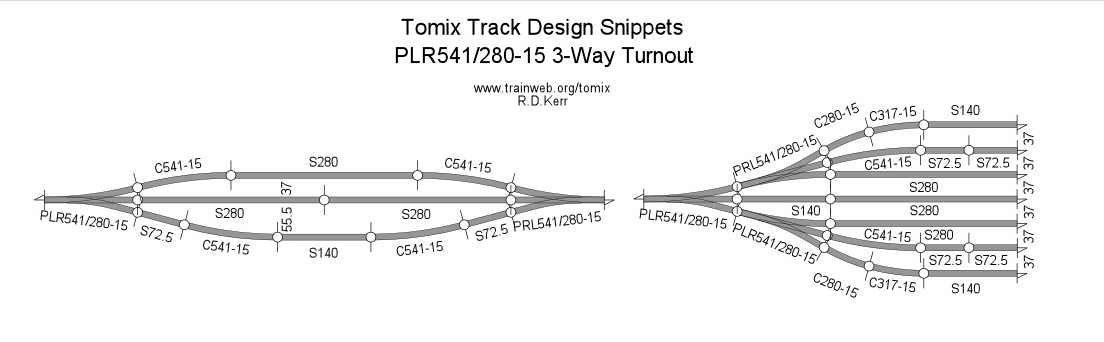 Figure 1: PL(R)541-15 Turnouts - The P541-15 turnout is the size most commonly used in Tomix layouts. Remember that ideas shown in these drawings can also be made in mirror-image. Feel free to experiment on your own, as well.