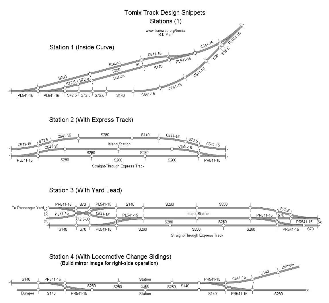Figure 14: Stations - Here are drawings of various station arrangements. "Station 2" shows a typical Japanese arrangement, with a straight-through express track bypassing the station platform. The track arrangement in "Station 3" keeps the express bypass track and also allows a train to go to or from the yard to either station track. "Station 4" is designed (with left-side operation) to cut an engine from a train in the station, then either run the engine around to the other end, or put it in a siding and bring out a second engine from the other siding to take the train in either direction.