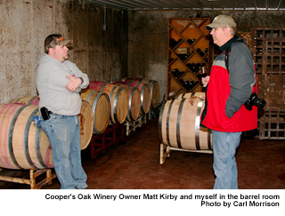 Thursday morning we got up and headed down to Higbee which is the home to The Cooper's Oak Winery. What makes this winery so unique is that it has a cooperage on the property. In fact the cooperage has been around since the 70's and the winery is only three years old. Don't let the fact that they're a relatively new winery fool you, they make some fantastic wines here. Toasted Oak is a Cabernet Sauvignon/Merlot blend with grapes that come from California. It has a gentle smokiness that rivals some California Bordeaux type blends. Triple Oak Bliss blends the same Cab/Merlot with a touch of Missouri Norton. You'll also find some of the traditional wines you find in Missouri. The Norton is excellent as are the Chambourcin and St. Vincent. They also have the sweet red, white and rose wines that are the hit in Missouri.