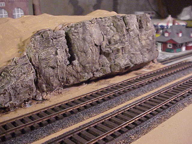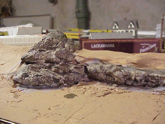 I colored the rocks by "leopard spotting" various Folk Art colors on the rocks. The colors in order that were used were Clay Bisque, Amish Blue, Burnt Umber, and Raw Umber. I "leopard spotted" by randomly dabbing a brush full of paint over the rock castings. I applied the colors in two applications. Lastly I went over them with a wash made from 5 parts blue windshield washer fluid and one part Folk Art Licorice.