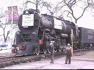 Santa Fe steam locomotive 2903 on display at Chicago's Museum of Science and Industry. On this February, 1994 day, the ambient temperature is about 10ºF with a wind chill well into negative numbers. |