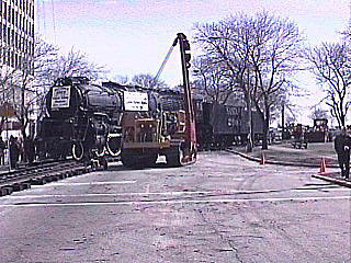 All pictures displayed are video captures from actual program footage unless noted. Program 100 In 1994, Chicago's Museum of Science and Industry decided to revamp and update the pieces it had on display outside and move them indoors. One item was deemed to large for this was Santa Fe steam locomotive 2903. Built in 1944, the 2903 is the largest engine of its type in the world. It was donated to the museum in 1963. Moving it would require traversing a mile and a half through parks and city streets to reach real railroad track. The Illinois Railway Museum in Union, Illinois was awarded the engine on the condition they would move it and care for it in an appropriate manner. In early 1995, preparations for the move began. Beginning in February 1995, this program follows Kevin McCabe and the members of the Illinois Railway Museum as they prepared the locomotive and then actually move it through downtown Hyde Park. The second portion of this program takes place in Hammond, Indiana. It involves a sampling of the train activity at the local Amtrak station. There is also a short segment taped at State Line Crossing, located about 5 miles south of the station. |