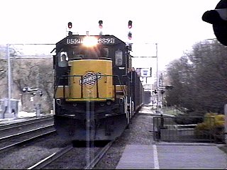 Chicago Northwestern C40-8 8521 leads a westbound unit coal train past the Metra station platforms in downtown Elmhurst. |