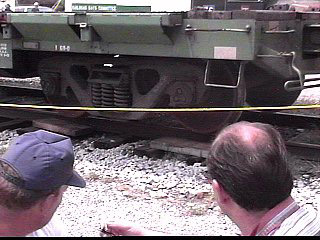 Burlington Northern displayed a rig for derailing and then re-railing a flat car. |