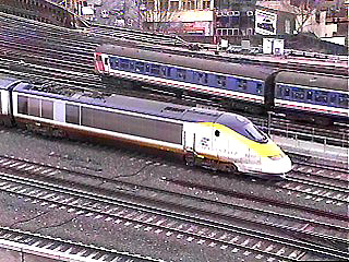 London-Paris-Brussels Eurostar trains arrive and depart from Waterloo. These trains are eighteen cars long and easily distinguishable from other trains. |