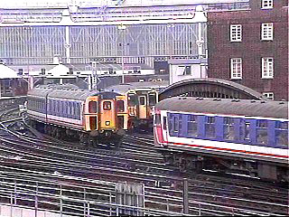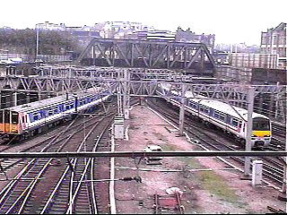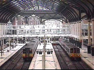 Trains entering and leaving Liverpool pass underneath an office building before emerging below street level, much like Chicago Union Station. The electric powered trains draw their juice from overhead wire. |