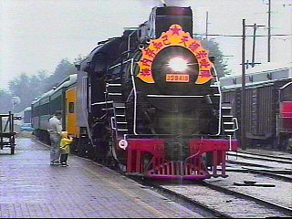 All pictures displayed are video captures from actual program footage unless noted. Program 107 A small town grain elevator, a steam locomotive restoration project, and a new (1988) Chinese built steam locomotive are all examined on this trip through Iowa. At Hinton, grain cars are loaded at the Farmers Co-0p elevator in August, 1995. Then, in Sioux City, we visit with Larry Obermeyer, President of the Siouxland Historical Railroad Society. The Society is in the process of restoring Great Northern steam locomotive 1355. They are also turning an old Milwaukee Road roundhouse into a museum that will become the engines permanent home. Taped in May, 1996. Finally we end up in Boone, Iowa and the Boone & Scenic Railroad. The railroad's desire to have a steam locomotive to pull its excursion trains led to the purchase of a brand new, Chinese built, engine that was constructed in 1988. Hayford Junction in Chicago, Illinois is the featured Hot Spot. The train speeds are low and there is no passenger service, but variety is the key here. Highlighted by an appearance of Alco locomotives from the Belt Railway of Chicago. Videotaped in June 1996. |