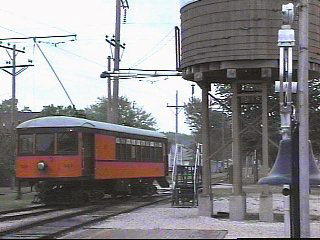 The Boone & Scenic Valley also operates electric and diesel powered trains. This beautifully restored Charles City western interurban cars heads toward downtown. |