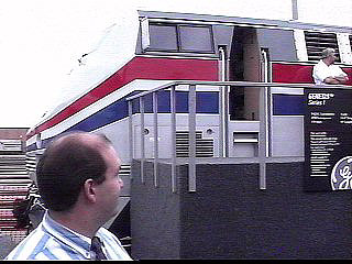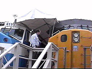 Dave gets a case of sticker shock as he checks out Union Pacific SD90MAC #8160, on display at the Electro Motive booth. EMD also showed a brand new Conrail SD80MAC and a BNSF SD70MAC. |