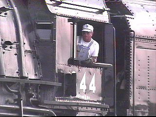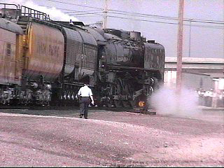 Steam hisses from open angle cocks as the 844 pulls the train ahead for loading. |
