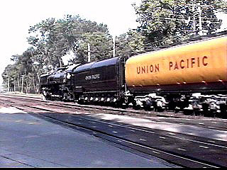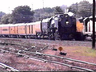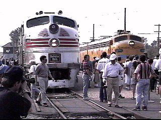 The next day, Union Pacific's trio of E9 diesels pulled an excursion out to the Illinois Railway Museum at Union. Weight restrictions on the Fox River bridge at Elgin kept the 844 at Proviso Yard. To load passengers for the return trip home, the UP train was brought right into the IRM station. |