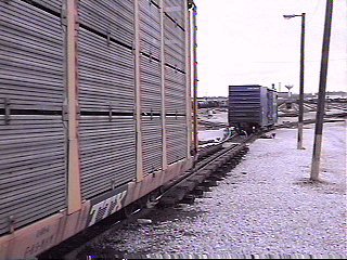 Blue Island features a hump yard for classifying trains. Retarders, visible just ahead of the auto rack car, control the speed of the cars rolling down into the yard. |