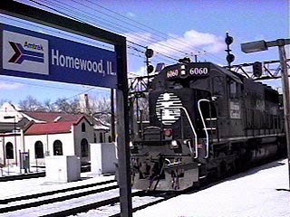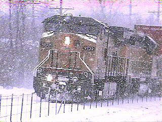 Two days later at Homewood, Illinois and the snow has now changed to cold. This freight is powering up to head south. |