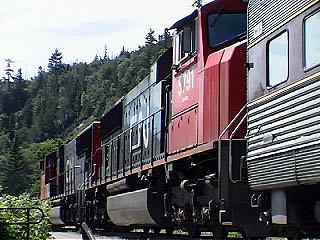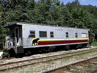 Who owns the railroad now is evident in this image. Canadian National SD75i's prepare to lead Algoma Central's popular Tour Train south back to Saute Ste. Marie. |