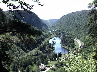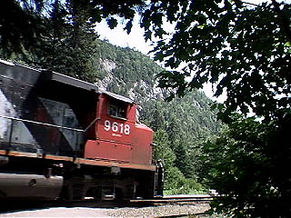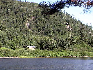 Our objective, the Agawa River Canyon, 114 rail miles north of Saute Ste Marie, Ontario, Canada. The Algoma Central mainline is visible on the right (west) bank of the river. The Canyon View is on a siding below, hidden by surrounding trees. |