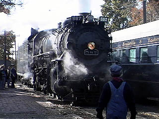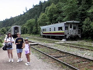 Our last day in the canyon. As the Tour Train departs in the background, train no. 1 (just out of sight to the right) backs down to pick up the Canyon View. This was also the day the Eco-Challenge TV show came to the park. |