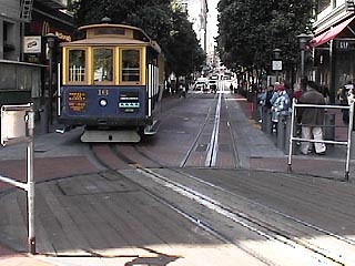 One of San Francisco’s renown cable cars coasts onto a turntable at the end of it's run. The two man crew will then spin the table by hand and head back on the other track. |