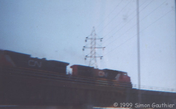 CN C-44-9W units crossing a viaduct with the 'Ultratrain' in Montreal