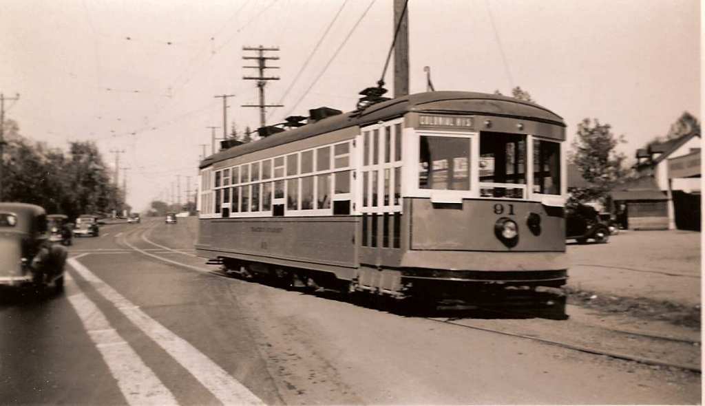 CCT 91, St. Louis 1925 42' steel, arch roof, 4 motor, one man car seen here northbound in Sacramento CA on Weber Street. Webmaster collection. Back to: CCT Roster