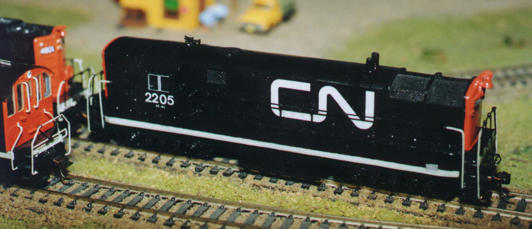 Also known as a 'Baby Train Master'. CN didn't have very many H-16s. I think there were eighteen in all. The 2200s were seen in Ontario and Quebec, but I highly doubt they ever made it out west. The last of these units was retired in 1967, but on my layout the 2205 was spared. I have a few other stray easterners in my collection too. I can't take a steady diet of GM power, which is about all I saw on the CN in the 1960s and 1970s. That's the nice thing about model railroading. You can run whatever you want wherever you want. Unlike the real CN, any non-GM power in my little fleet operates in Western Canada. The CN H-16 is fairly easy to model. A bell and horn are all I added. The bell was fabricated out of a spare Athearn SW-7 bell and a piece of styrene filed to shape. I also inserted some small pieces of plastic in the number boards to create a flush surface for rubbing on some very tiny numbers. I went through almost a dozen 2s before I finally got all the numbers to stick. The number boards could have been made a little bigger on this loco. I've seen a picture of an H-16 in the wet noodle scheme only once, and I had to rely on my memory as I was decorating this model. Even if I got it wrong I still think it's worth showing off.