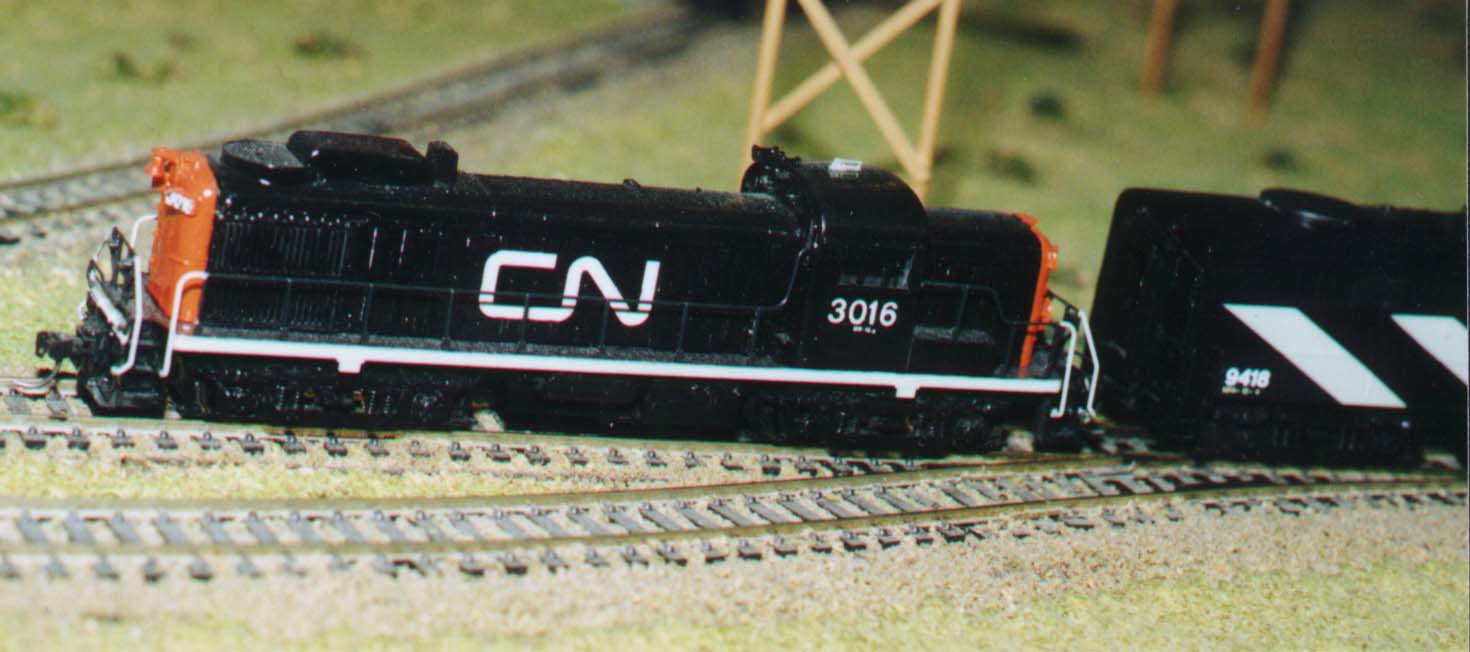 There were two production runs of the HO scale Atlas RS-3 in CN, but none were in the wet noodle. There was a wet noodle version in N scale, but the grey stripe around the frame is missing. In any case, all of Atlas's RS-3s in Canadian road names were limited editions and out of my price range. This particular unit was purchased undecorated for about $55 in 1985, and the original shell met its demise after I made a futile attempt at spray painting. I found a replacement shell in a US road name (Santa Fe tiger stripes) and partially stripped it before repainting it in CN. The C-D-S CN roadswitcher decal set comes with two sizes of wet noodles, and the smaller wet noodle fits nicely over the blank spot between the louvers on the hood doors. I photographed the loco from the fireman's side because the wet noodle is a little high on the engineer's side. That's the problem with working with dry transfer decals - if you don't align them properly before you rub them down there's no second chance. Oh well, remember the three foot rule. CN RS-3s with louvered doors had small wet noodles halfway up the carbody. Model Power's RS-2 and Roundhouse's RS-3 are correctly lettered, but they have the wrong road number. CN 3900 had a large wet noodle and vertical box filters in the side doors. And speaking of nit-picking, I found that Atlas's RS-3 differs in many ways from CN and CP prototypes. The battery boxes, handrails, fuel tank, headlights, and engineer's cab side window on the Atlas RS-3 depict the early ALCO version (phase 1?), and the shell would require a fair amount of work to represent the MLW version. I'm not that handy with a file and a hobby knife, so all I did was add angled number boards and a few other odds and ends to make it vaguely resemble a CN unit. Close enough for jazz.