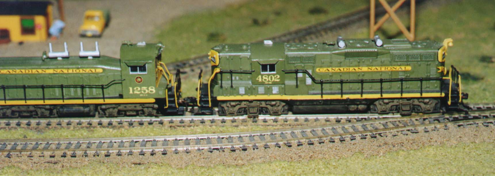 After having done a couple of locos in the CN wet noodle scheme, I decided to take a crack at doing the green and yellow. I'm not all that crazy about CN's paint schemes of the 1950s, but the green and yellow does break up the monotony amongst a sea of black and orange locos. The SW-1200RS was the first unit that I painted in the green. Miniatures by Eric makes a nice CN SW-1200RS parts kit, but I was too tight with a buck to buy it. The Miniatures by Eric and Juneco kits are correct for modeling a 1300 series SW-1200RS, but I wanted to model the earlier 1200 series version with the flat topped number boards. I had to fabricate my own number boards out of styrene and clear plastic, and they look reasonably close. As far as the paint goes, I concocted CN green out of a little bit of Testors Mat Sea Blue, Mat Cavalry Yellow, Mat Military Brown, and a drop of Flat Black. There was a lot of luck involved in this process, and if I were to do it all over again I'd buy Badger Model Flex paint in CN green instead. I got CN dark mustard yellow by mixing the flat yellow with a bit of flat military brown. I'm just wondering if any of CN's paint was army surplus. For the truck weathering I use a mix of Testors flat black and flat military brown. I did the top part of the ends of the Geep by hand, but not the Vs. The Vs come with the decal set. To get pin striping I used one of those ultra fine tip marker-type pens. I can just hear some of the more seasoned model railroaders saying 'You idiot! Buy an airbrush and use Accu-Cals!' But there's one thing I remember to do that most other model railroaders forget. Paint the frames of the cab side windows aluminum. GM, FM, and some ALCO and Baldwin diesels had aluminum cab side windows. Yeah, but nobody's perfect. When the loco is done to your liking, just stick it on the track and stand back and watch it run. That's what it's all about.