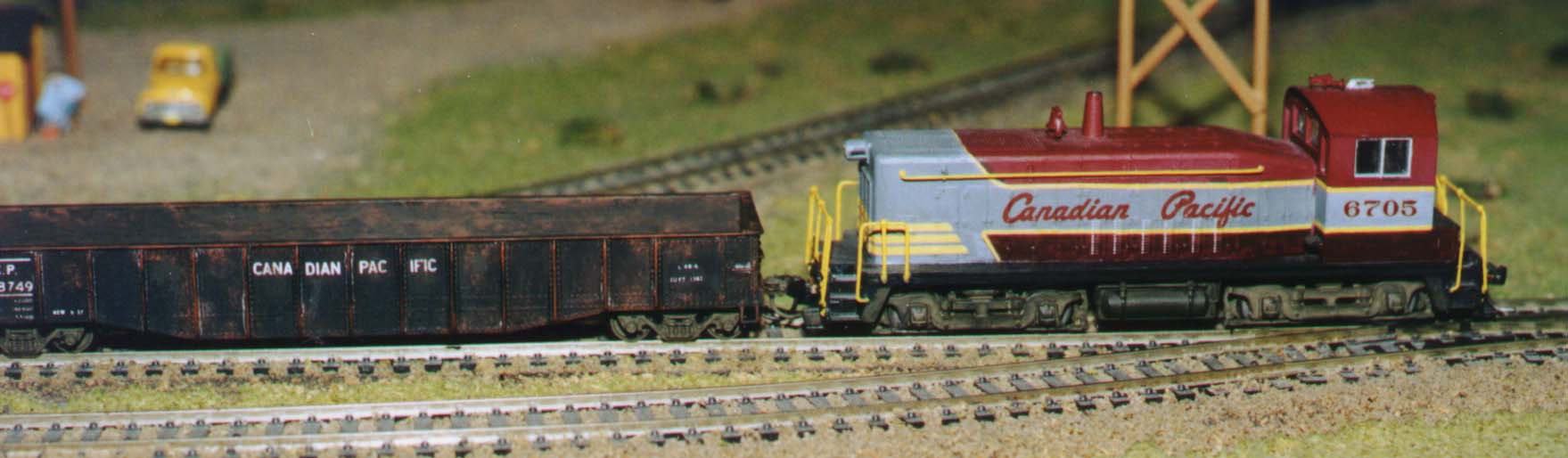 When I think of GM switchers, I think of CN, not Canadian Pacific. CP had a small fleet of GM switchers, and ten of them were SW-8s. SW-8s and SW-9s were normally found in Ontario, while the SW-900 fleet was assigned to Alberta. I lived in Saskatchewan most of my life and I never saw a CP GM switcher. So why did I paint one? Just for curiosity's sake. I find that the CP GM units look best in the script scheme, and I'm happy with the way this one turned out. I didn't paint this unit entirely myself. I thank Keith Brown for spraying on the initial coats of Tuscan Red and grey. I was a little leery about doing this paint scheme myself, but after getting a good look at the pattern I later did a couple other locos in script. The yellow stripes on the pilots were hand painted due to the fact that C-D-S decal sets don't come with pilot stripes. Any engines that have crooked pilot stripes get a good dose of grime overtop to hide the irregularity. The colours tend to vary on this loco because there is a combination of Testors, AccuPaint, and Badger Model Flex paint on it. What I find more interesting in this photo is the gondola the switcher is pulling. I bought some Testors rust paint and tried my hand at weathering an Athearn fifty foot gondola that I painted in CP. Now all I need is a scrap load.